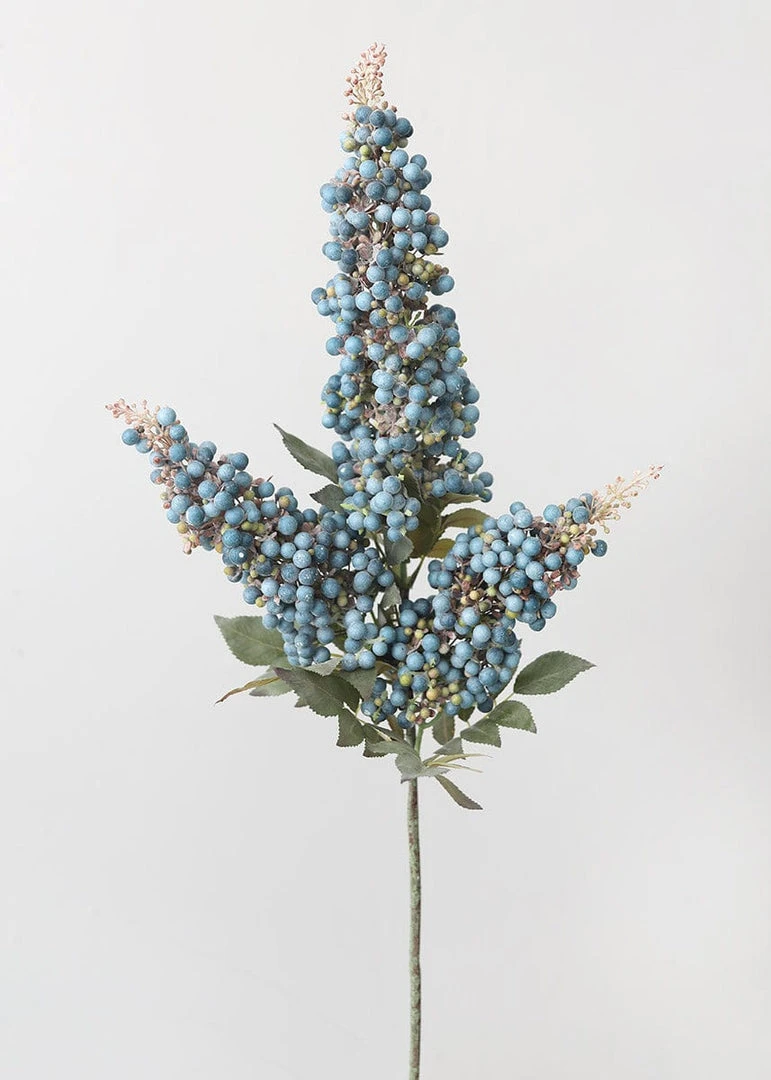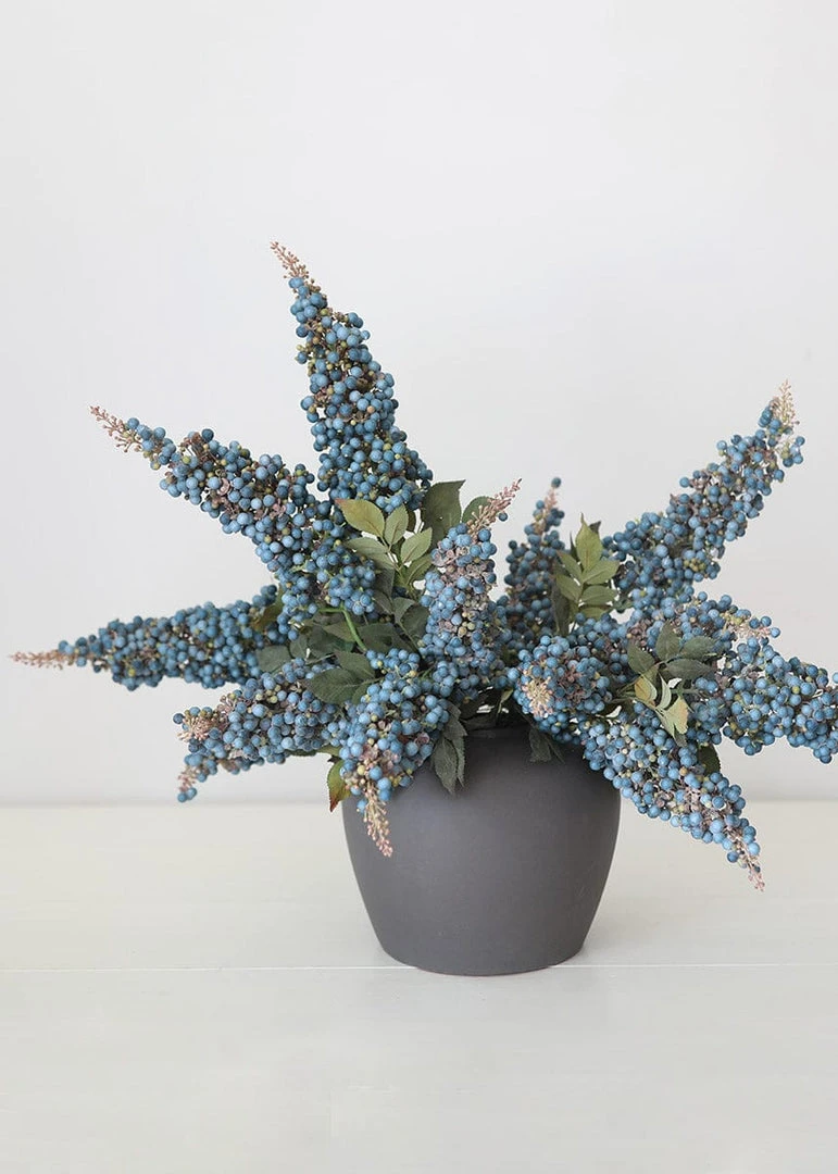 Simple home decor starts with oversized, artificial floral stems dramatic enough to be styled alone in a highly decorative statement vase. Create an arrangement made to last with these large, fake blue berry clusters to achieve that elevated look. The mix of blues and greens gives the berries a more natural appearance.