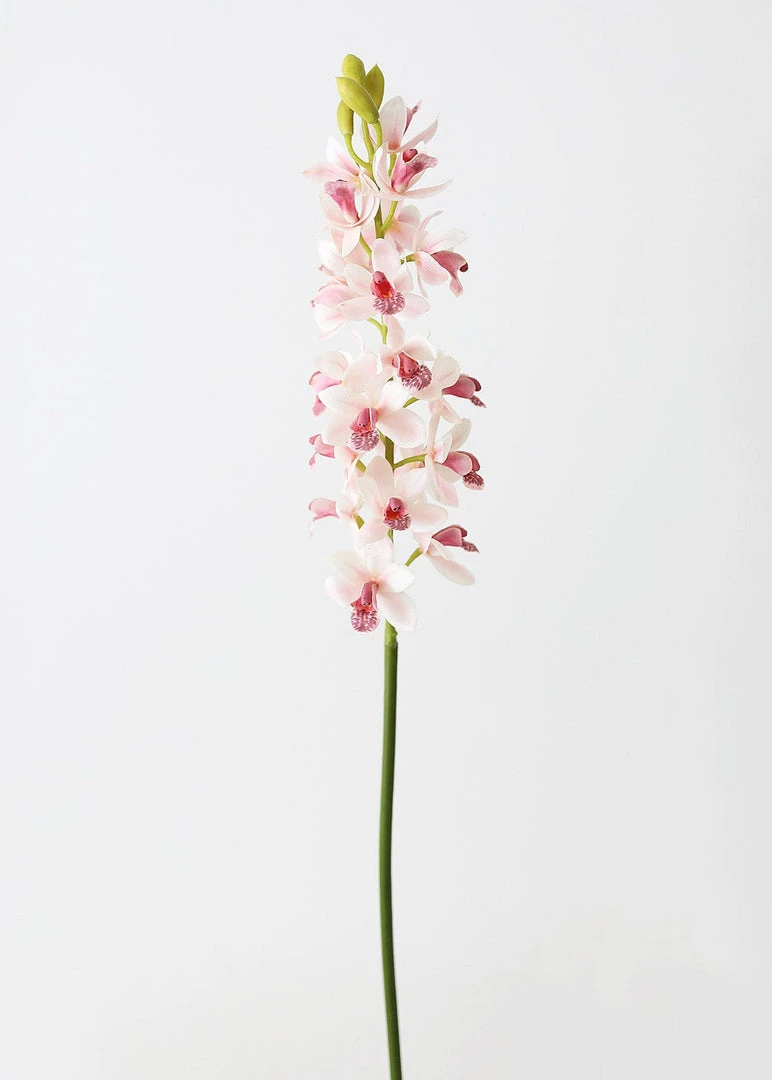 Find tropical fake flowers, like this cymbidium orchid spray in a beautiful light pink with mauve centers. Simply style the artificial orchids in your favorite vase to enjoy permanent botanicals that last.