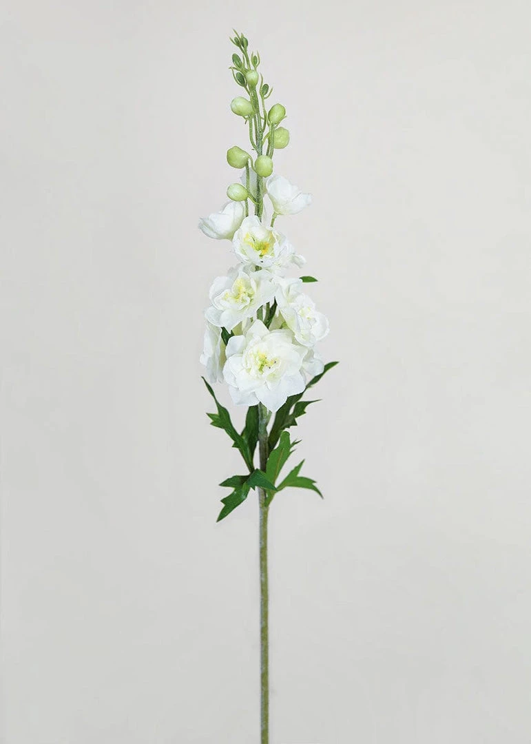 These aren’t your grandmother’s fake flowers. These white delphinium wildflowers feel as real as they look, with real-touch petals that feel damp to the touch. The flocked stem adds an extra layer of realism that makes this stem truly irresistible. The cream-white petals offer a soft yellow interior with a pistachio green plastic detail in the center. In true Larkspur wildflower fashion, this faux beauty mimics nature with glistening buds that form the signature “spike” of the delphinium and this majestic stem will draw attention from a distance.