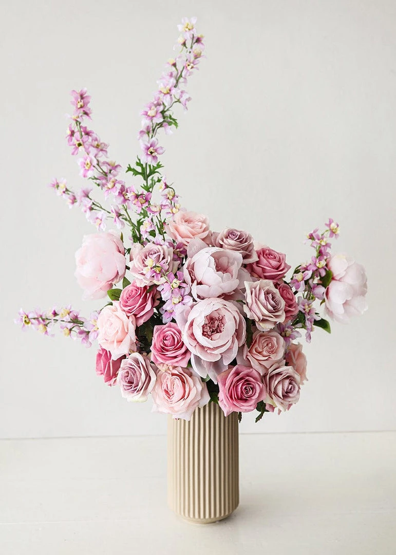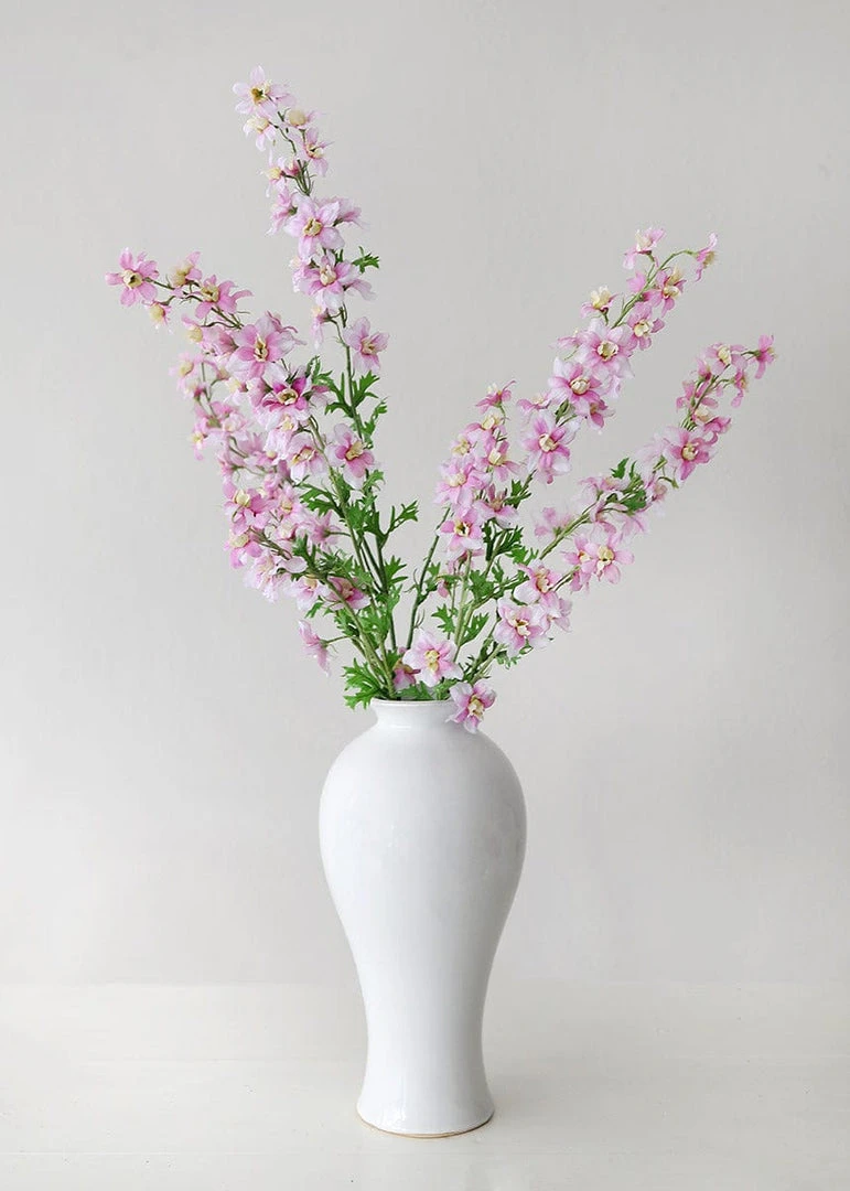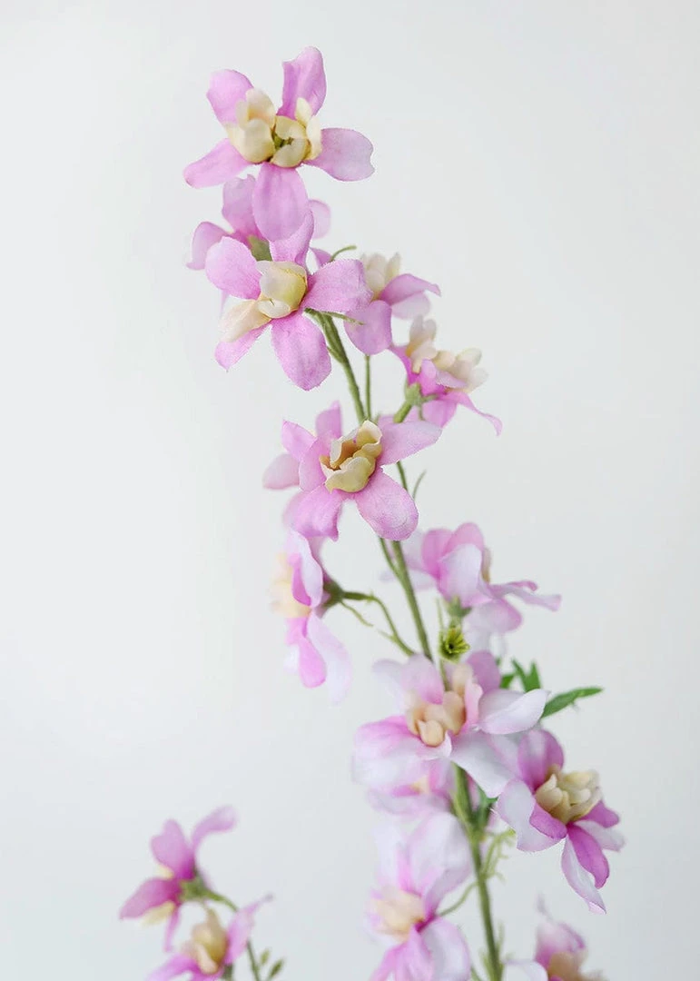 Add some playful charm to your bouquets and faux floral arrangements with these whimsical artificial pink lavender delphinium wildflower stems. The delicate petals feature tones of pink lavender, ivory, with a hint of cream green.Â