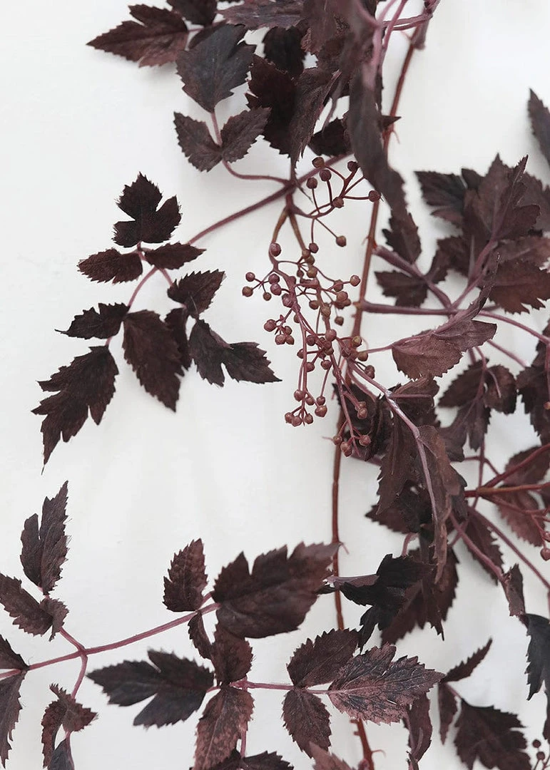 Add a nature-inspired look to your mantle centerpieces and wedding tablescapes for fall with this stunning plum purple artificial Cimicifuga Ramosa leaf garland. The incredibly realistic Hillside Black Beauty leaves have a dramatic, rich hue that complements any autumn color palette.