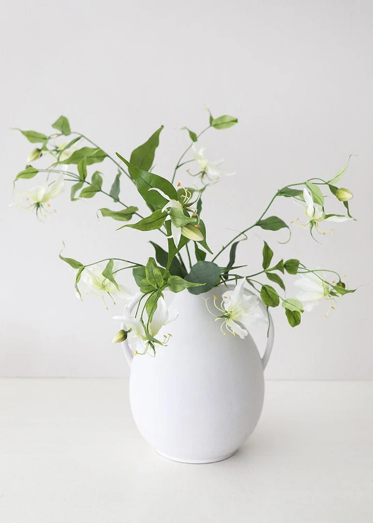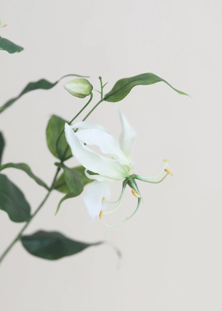Add a fun, tropical touch to your floral arrangements with these tall cream artificial gloriosa lily branches. These whimsical petals offer an off-white outer tone that works itself into a cream green. The dark green leaves are detailed with a brushed finish for natural-looking dimension.Â
