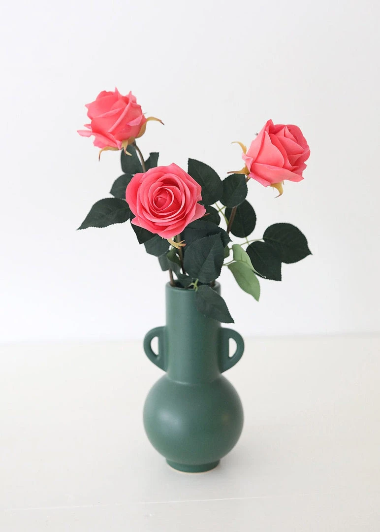Find trendy vases for your home decor like this dark green ceramic vase with handles. It’s the perfect statement piece to showcase a bold and colorful flower arrangement.