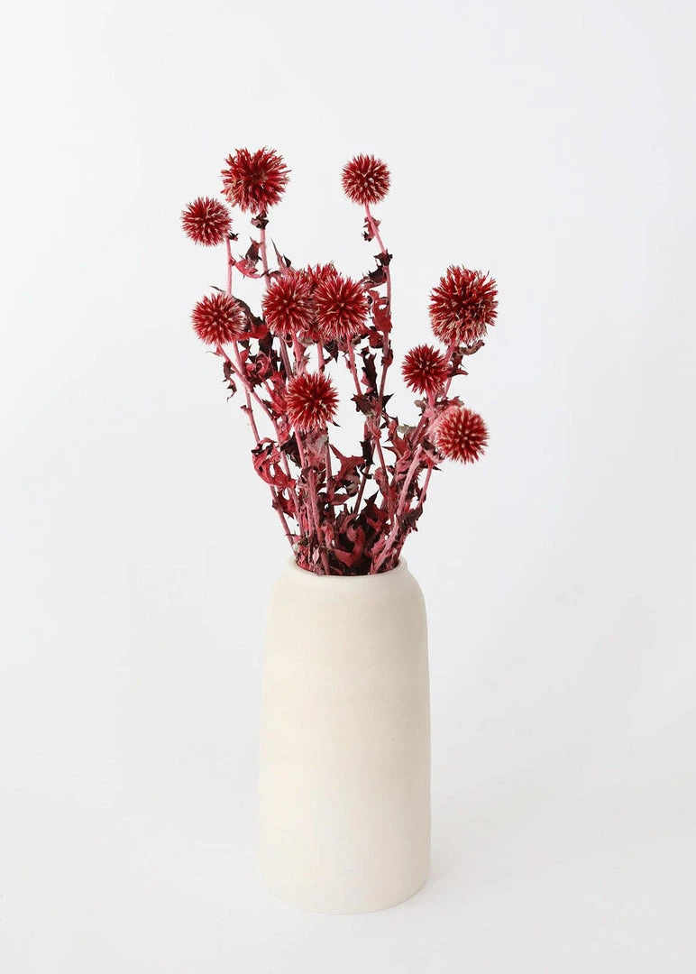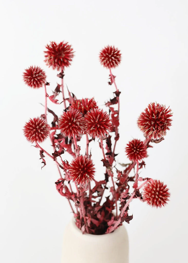 Add a touch of texture to your dried flower arrangements with red burgundy dried echinops thistle flowers. Delicate and funky, these red dried thistle flowers are perfect styled alone in a bud vase or tucked into a dried flower arrangement for extra depth and dimension. Dried and preserved items may arrive with a slight odor, allow to breathe for 5-7 days in a well-ventilated area.