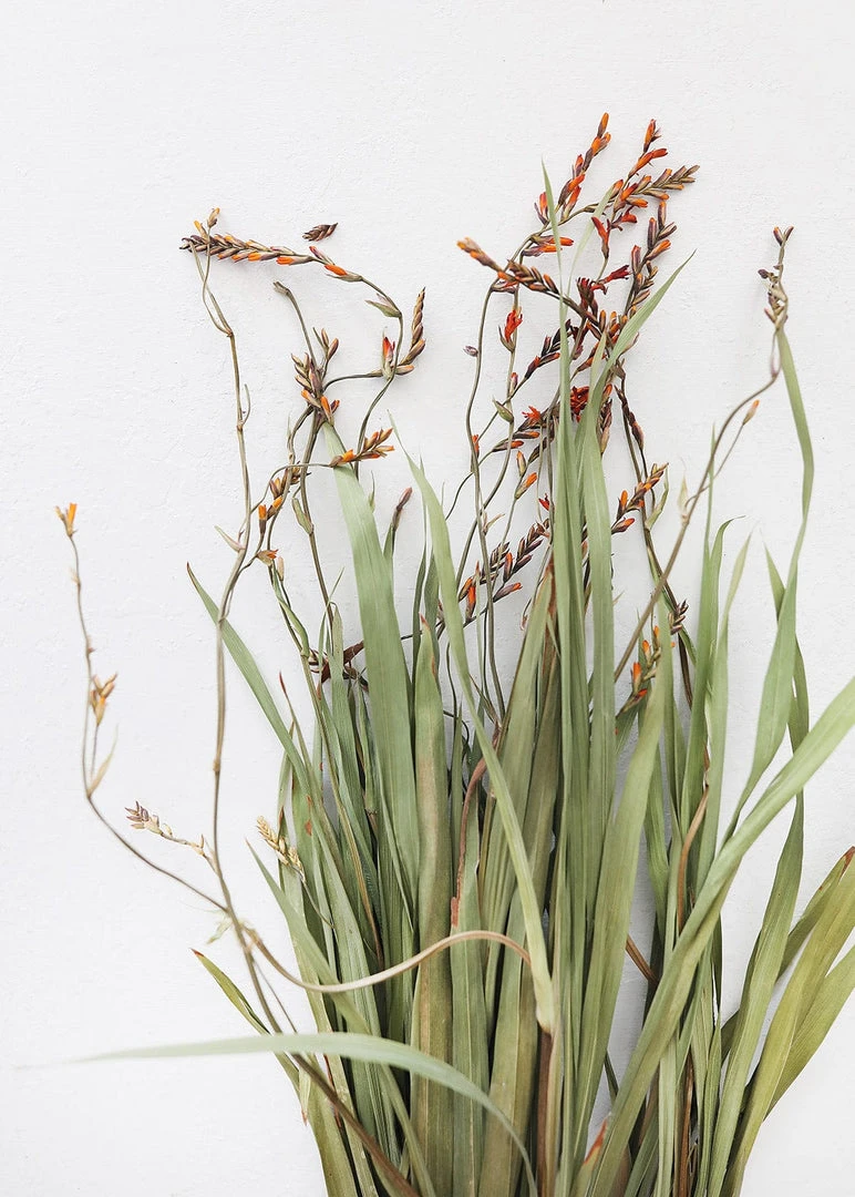 Find natural grasses for your vase decor, like this green dried renanthera grass with orange buds. It’s perfect to showcase alone, or add to a flower arrangement for pops of color and textural elements. A naturally beautiful product, each bundle is unique.