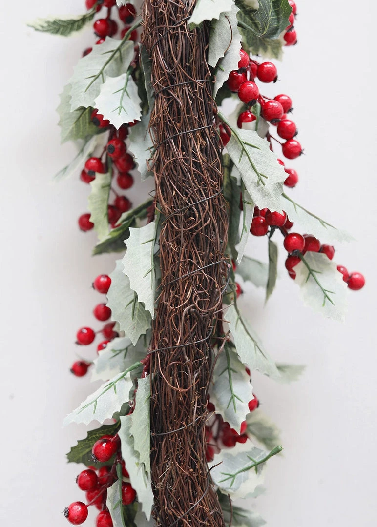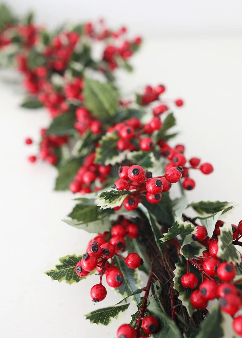 Take the simple approach to your winter home decor with fake holiday greens and Christmas greenery garlands that last. This variegated green white artificial holly leaves garland with red waterproof berries on a grapevine base is a festive choice.