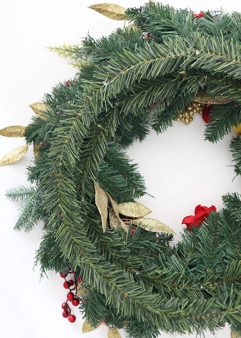 Find artificial Christmas wreaths, like this festive pine wreath. It’s decorated with red and gold accents including ball ornaments, glittered fake berries and leaves, and small flowers. The red velvet ribbon completes the look.