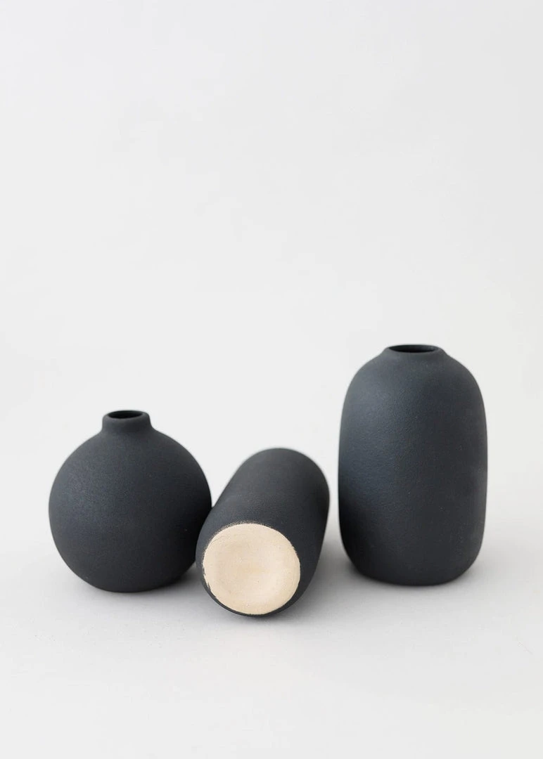 Find flower vases in different shapes and sizes for home tabletop and shelf styling, like this set of matte black ceramic bud vases. Simply use a combination of artificial and dried stems to create your unique designs.