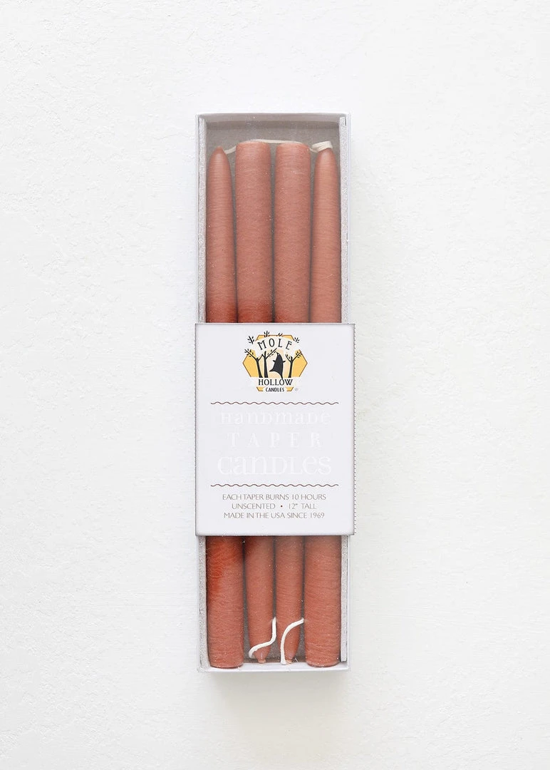 Find colored candles to set the mood of your decor or event, like these unscented, hand-dipped taper candles in Terra Cotta. The warm terracotta color perfectly complements autumn centerpieces and fall weddings.